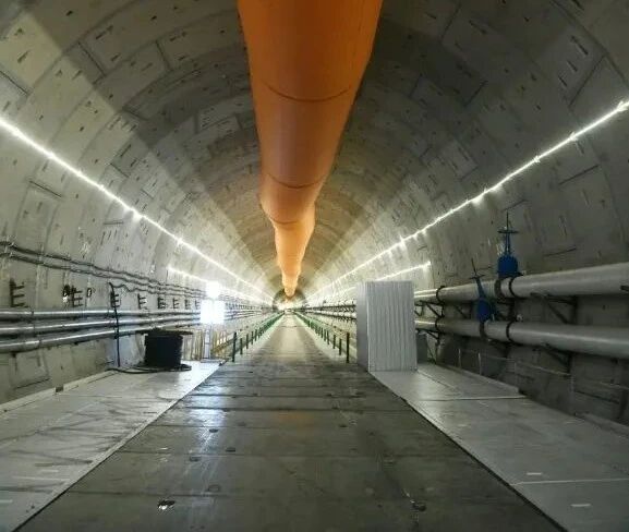 在頂部距離江面31米的海底隧道施工現(xiàn)場(chǎng),記者看到,一環(huán)環(huán)外徑達(dá)到13米的管片組成隧道的主體空間。隧道里的中間箱涵和邊箱涵也在同步建設(shè)當(dāng)中,中間箱涵邊箱涵均留有空洞。邊箱涵主要用于通風(fēng)。中間箱涵在施工階段作為物流通道使用,在隧道通車后,中間箱涵則可作為應(yīng)急通道。若列車在隧道中發(fā)生故障,車上人員可以通過樓梯進(jìn)入中間箱涵離開隧道。